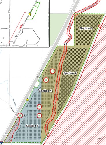 Formal notices of property closure and the need to vacate will begin by March 2026 for individuals living in sections 1 and 2 of the Temporary Safe Stay Area. Those receiving notices will have the opportunity to relocate to the remaining 75 acres (sections 3 and 4, see map below) and will be offered services to find alternative housing, if available.