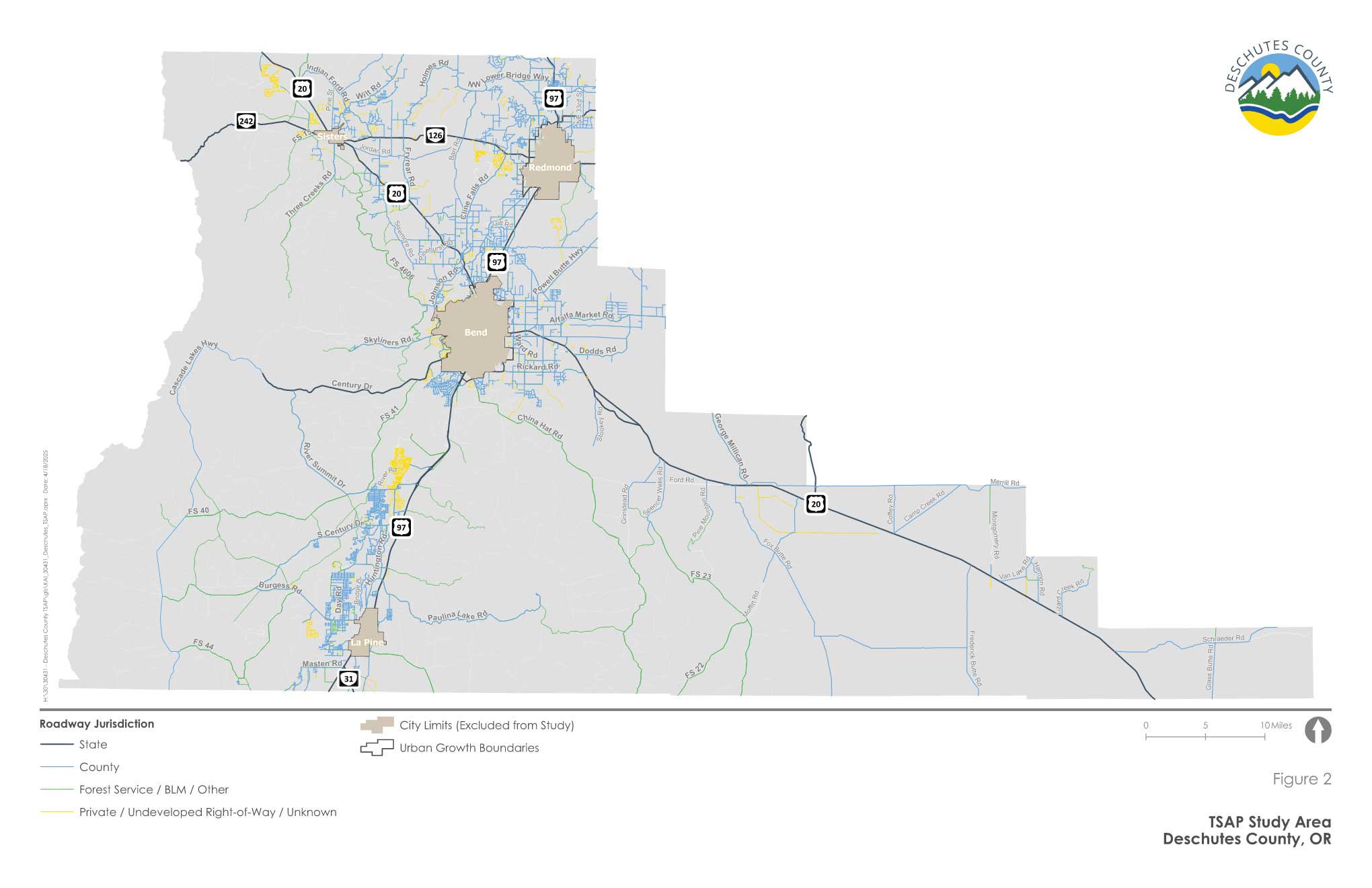 The study area for the Deschutes County TSAP Update will focus on all public roads within the county and outside of all incorporated city boundaries.